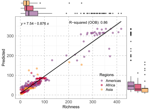 研究结果揭示了明确的环境因子驱动模式:水分可用性是影响树种α多样性的最主要因素,而土壤特性在局域尺度上起着同样显著调节作用。进一步分析表明,这些环境因子存在“共同限制”效应,即热带树种多样性受制于多个环境维度的协同作用,而非单一因子的独立控制。这也解释了为何在如亚马逊流域等水热与土壤条件俱佳的区域,会形成全球树种多样性极高的森林群落。