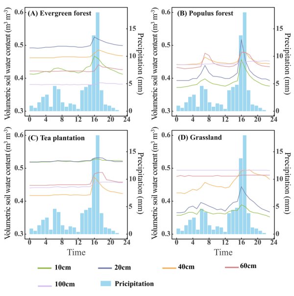 研究结果表明:(1)雨季茶园的土壤水分含量最高,而干季常绿阔叶林保持了最高的土壤含水量;(2)草地和茶园的土壤水分波动较大,尤其在干旱季节表现突出,常绿阔叶林则表现出更为稳定的水分保持特征;(3)不同植被类型对土壤水分的入渗过程有显著影响,草地入渗过程迅速但保水能力有限,而常绿阔叶林凭借较完整的冠层、厚实的枯落物与良好的土壤结构,降水入渗过程较为平缓,水分保持效果较好。