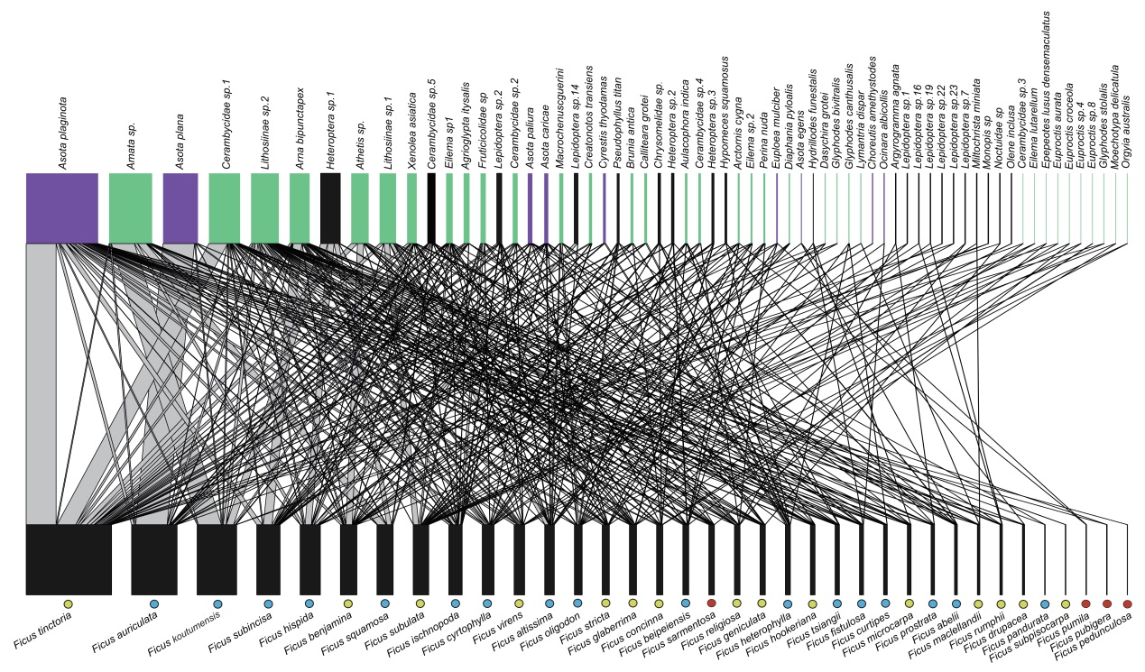 在热带雨林中,桑科植物榕树(俗称“无花果”)是一种防御策略非常多样性的植物。榕树具有地生、半附生和附生型三种不同的生活型。地生型榕树即自身独立成株,附生型榕树需要依附在其他载体上才能成活,半附生型榕树幼年阶段需要依赖载体生存,成年阶段独自成活。它物种多样,叶片坚硬、受伤后会流出乳汁,叶片苦涩等等。然而即便具有众多防御策略,榕树也无法逃脱被昆虫取食的命运。