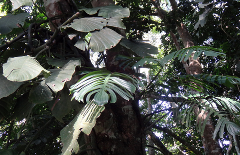 大叶崖角藤沿着树干向上爬,鲜明的显现出热带雨林的特征。版纳地区,藤与树,蕨与树,绞杀榕与树,附生灌木与乔木,寄生与树,附生的草本与树,展现独特的物种关系—永远纠缠不清的关系,同时光影参差、姿态万千,是造型、造景值得关注,值得潜心经营的主题。