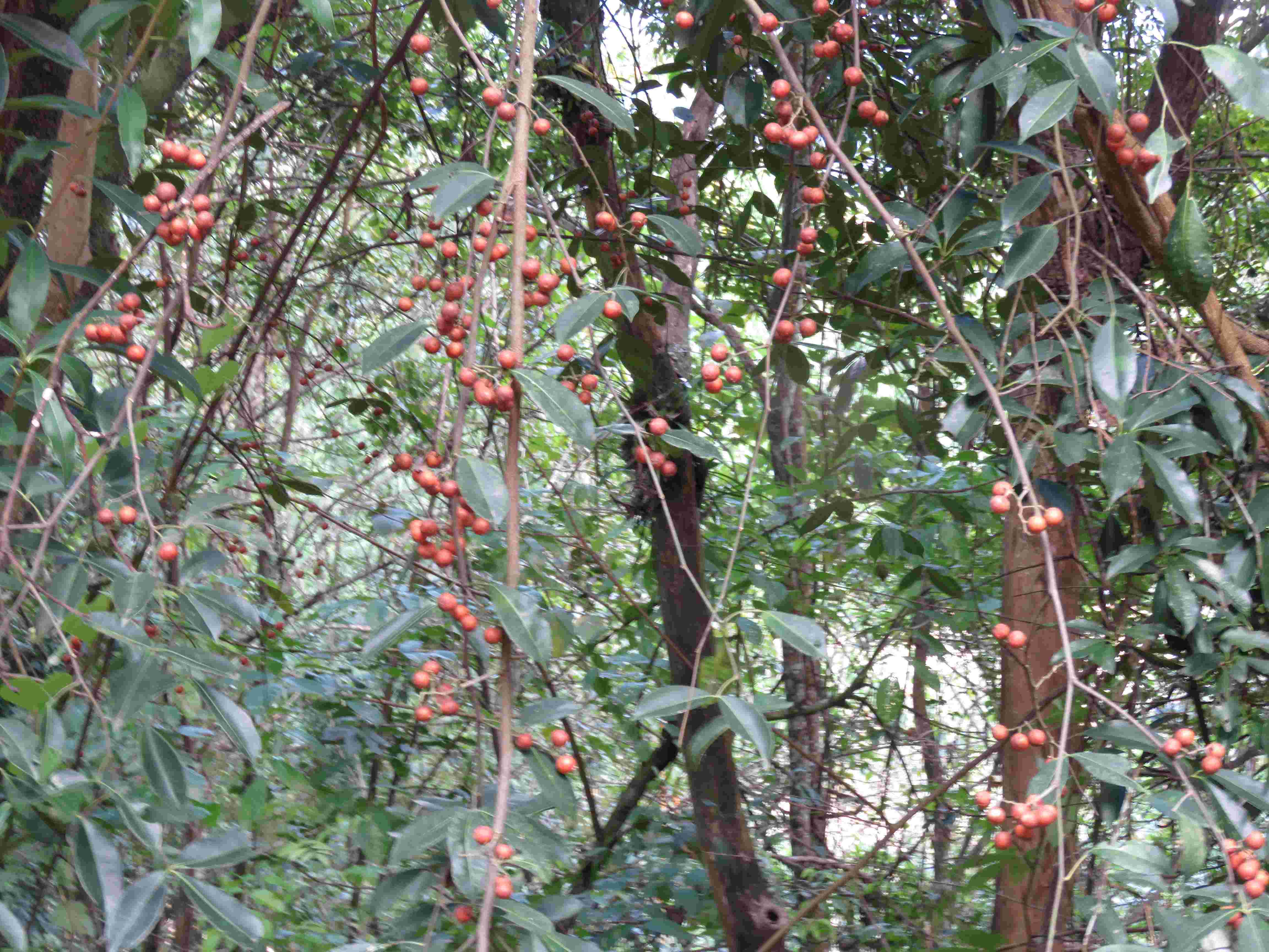 飞龙掌血(Toddalia asiatica (L.) Lam.)为芸香科飞龙掌血属植物,别名较多,有散血丹、猫爪簕、大救驾、刺米通等,其老茎干有较厚的木栓层及黄灰色、纵向细裂且凸起的皮孔,三、四年生枝上的皮孔圆形而细小,茎枝及叶轴有甚多向下弯钩的锐刺。小叶无柄,对光透视可见密生的透明油点,揉之有类似柑橘叶的香气。雄花序为伞房状圆锥花序;雌花序呈聚伞圆锥花序。花朵细小,淡黄白色;萼片长不及1毫米,边缘被短毛;花瓣长2-3.5毫米;果橙红或朱红色,径8-10毫米或稍较大。花期几乎全年,但春季和夏季开花较多,果期多在秋冬季。