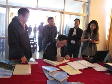 临行前刘玉洪常务副站长把介绍版纳植物园的VCD、《云南哀牢山种子植物》及《美丽银生》等部分书籍送给客人。