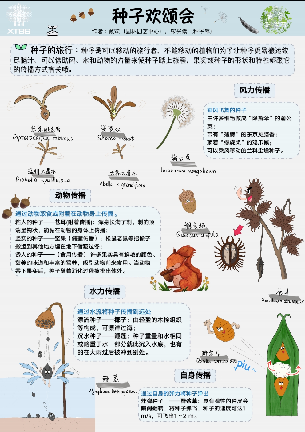 种子的旅行:种子是可以移动的旅行者,不能移动的植物们为了让种子更易搬运绞尽脑汁,可以借助风、水和动物的力量来使种子踏上旅程,果实或种子的形状、特性都跟它的传播方式有关哦。