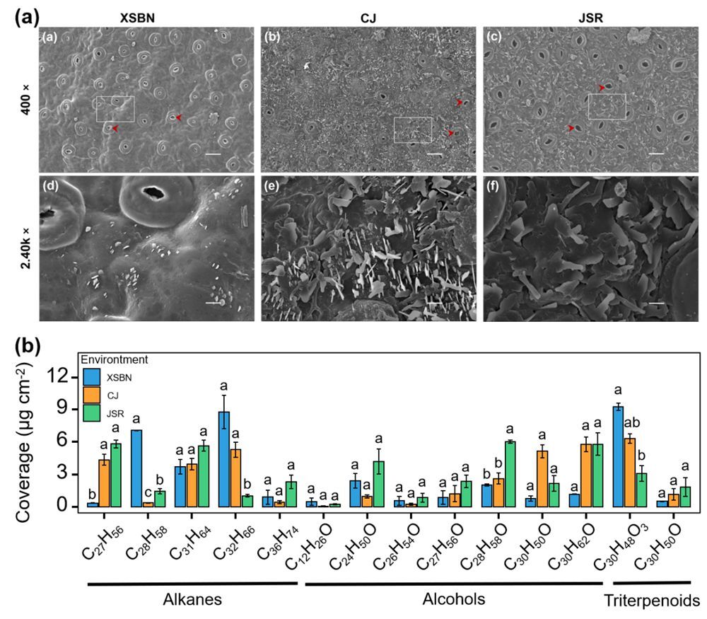 研究发现,与湿热环境相比,极端干热环境中清香木叶片的比叶面积和光合色素含量显著降低;在干热复合环境中,清香木叶片气孔密度无明显变化,但气孔面积显著增加;同时,叶片表皮蜡质层中C28伯醇的覆盖度显著升高,从而促进板状蜡质晶体的形成与沉积。结果表明,清香木在干热复合胁迫下采取了气孔—蜡质协同调控的适应策略:在持续干热胁迫下,通过增大气孔面积但不改变其密度,优化了叶片的散热效能;同时,通过增加醇类蜡质的合成与板状蜡质晶体的沉积,构建了兼具高反射光线与疏水功能的屏障,以调节叶温并减少蒸腾损耗。这种多性状的协同适应策略赋予了清香木对极端干热复合环境优异耐受性。研究结果为未来极端复合环境背景下干热河谷区的生态恢复树种选择提供了直接的理论基础,也为预测植物在未来复合气候变化情境下的分布格局和生长表现提供了机理性框架。