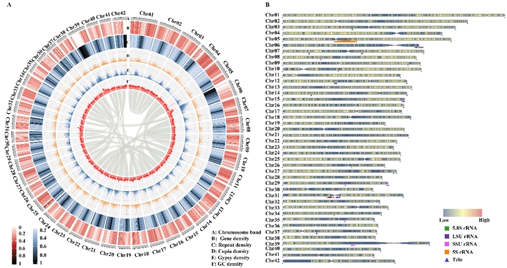 图2 米仔兰染色体水平基因组组装和基因组特征。