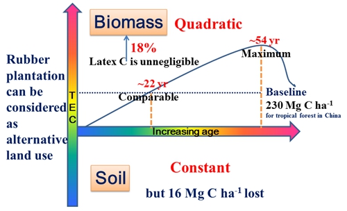 随着全球 CO2 浓度的急剧上升,热带森林生态系统的固碳作用显得尤为重要。然而,为了追求较高的经济利益,大面积热带森林逐渐被人工经济林(如橡胶)所取代,进而降低了其固碳潜能。目前,橡胶林作为热带最主要的土地利用类型之一,其是否能够成为REDD+ C尚存在争论。为此,诸多研究已评估了不同林龄橡胶林的生物和土壤碳储量,但它们都忽视了胶林系统中最为重要的胶乳碳。此外,对于净初级生产力(NPP)随年龄的变化也缺乏研究。Kotowska 等(2015)研究表明,胶乳碳对橡胶林生态系统 NPP 贡献可达 20-31%。另一方面,土壤有机碳随树龄的变化呈现出增加、不变或降低等不确定性。