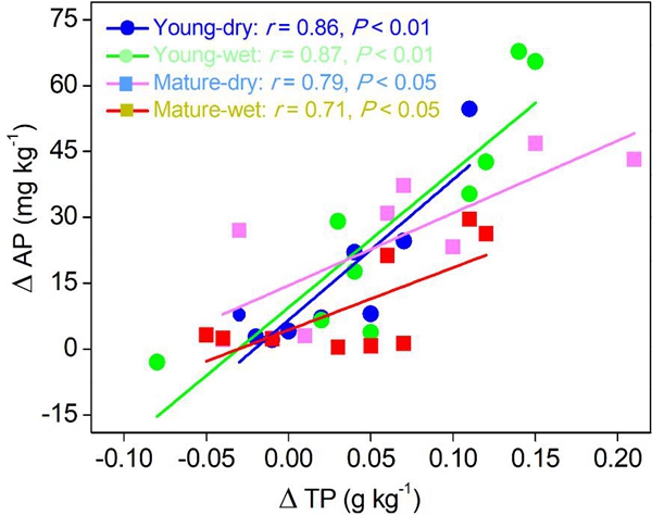 干湿季胶林复合系统土壤有效磷与总磷净变化关系