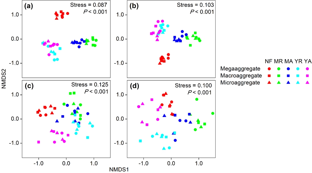图1. 不同土地利用方式土壤团聚体真菌群落差异(腐生真菌a、病原真菌b、共生真菌c及丛枝菌根真菌d)