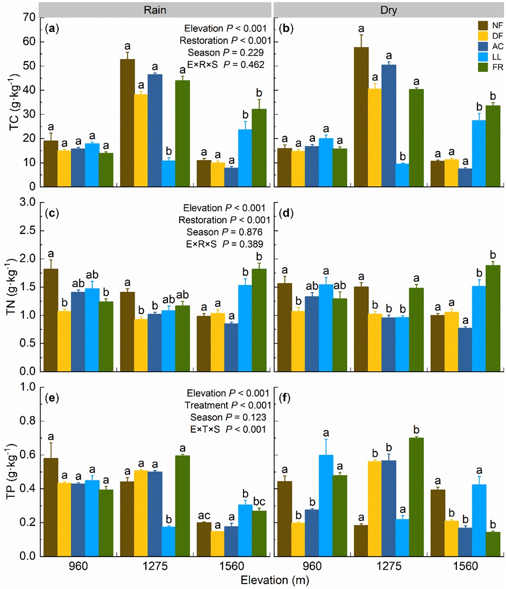 图2 不同恢复方式下稀树灌草丛土壤养分随海拔和季节的变化。