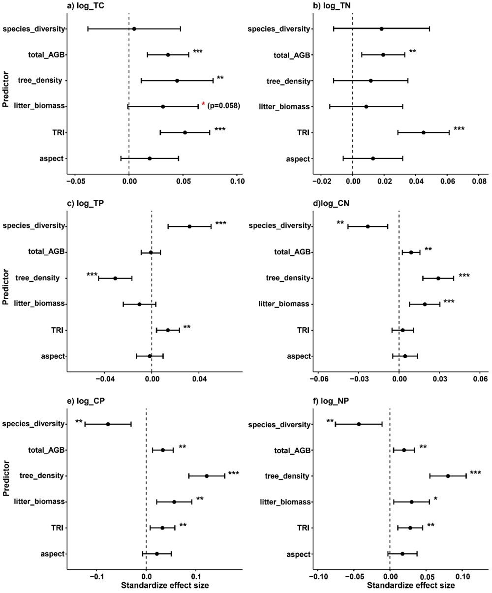 图1 线性混合效应模型估算的植被和地形因素对土壤养分计量的标准化效应
