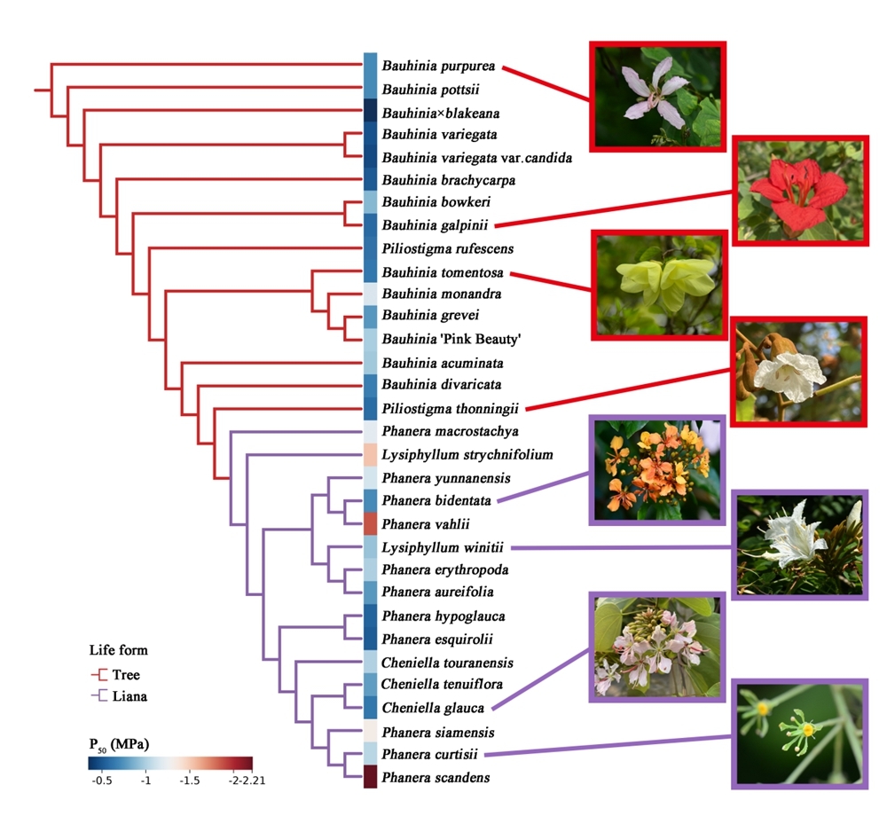 相关研究成果以“Floral hydraulic strategies divergence in Bauhinia s.l.:lianas adopt drought tolerance while trees prioritize drought avoidance”为题发表在国际植物学期刊New Phytologist上。版纳植物园植物生理生态研究组博士研究生柯妍为该论文的第一作者,张教林研究员、张云冰副研究员和美国纽约大学的Adam B. Roddy副教授为通讯作者。章永江研究员为该研究提供了重要建议。该研究得到了国家自然科学基金项目、云南省基础研究计划项目和版纳植物园“十四五”等项目的资助。