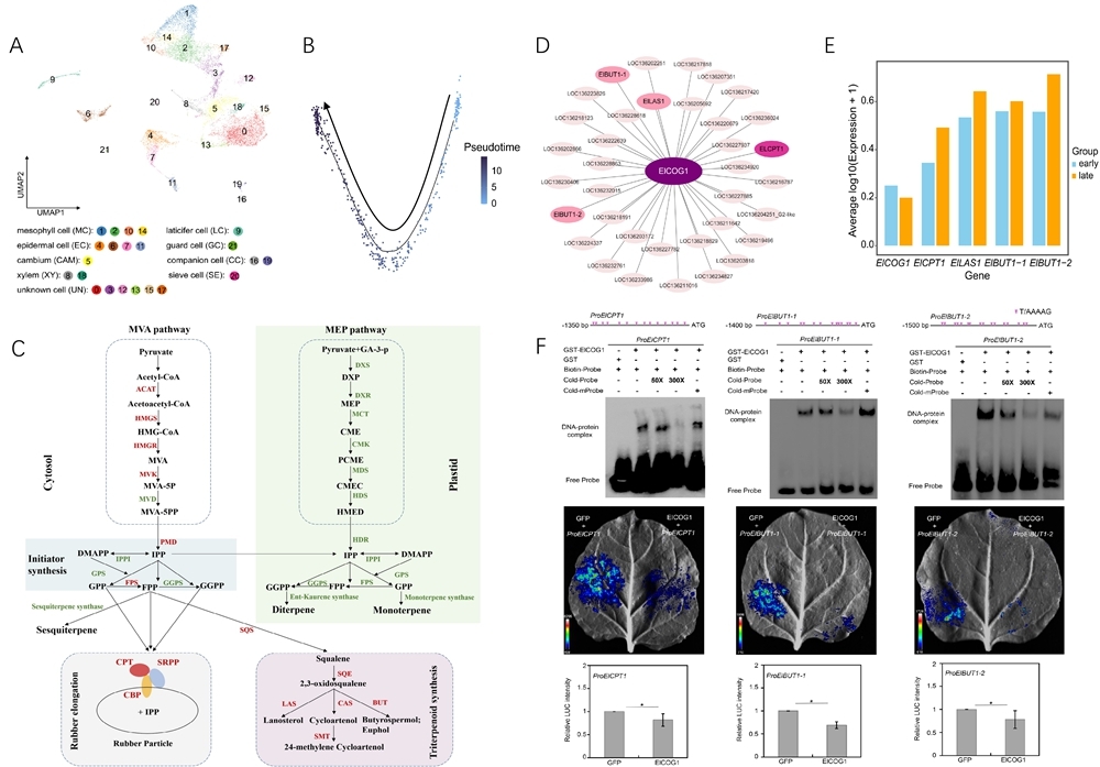 1 续随子叶片单细胞图谱橡胶与三萜协同调控关键调控因子功能验证A 续随子叶片单细胞核转录组聚类与细胞类型鉴定;B 乳管细胞簇的伪时间发育轨迹;C 乳管中萜类和橡胶生物合成途径示意图,红色高亮基因表示通过单细胞核转录组分析鉴定到的乳管差异表达基因(DEG);D EICOG1为中心的共表达子网络及其预测靶基因;E EICOG1及其预测下游基因的伪时间表达动态。F EICOG1对橡胶和三萜合成关键基因启动子的转录抑制作用验证。