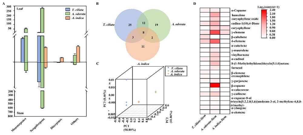 图1 米仔兰、印楝和红椿精油成分比较分析。