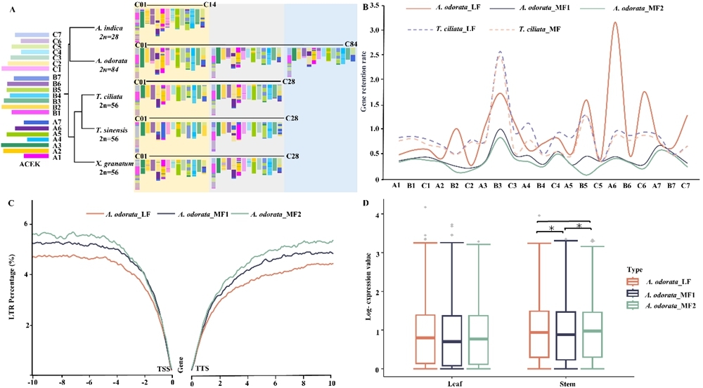 为揭示楝科植物演化和气味差异的分子基础,中国科学院西双版纳热带植物园(以下简称“版纳植物园”)植物基因组演化与次生代谢研究组开展了代表性物种比较研究。精油成分检测显示,米仔兰叶片和茎中挥发性化合物总含量显著高于印楝和红椿,以倍半萜类化合物为主,石竹烯(Caryophyllene)、可巴烯(Copaene)等为主要成分。研究团队整合多种测序技术,构建了米仔兰高质量单倍型基因组(Hap1:462.31 Mb, Hap2:448.91 Mb)。系统进化分析发现,米仔兰经历了物种特有的全基因组三倍化(WGT)和偏好性亚基因组进化;WGT后其萜类合酶基因家族(AodTPSs)拷贝数减少。功能验证表明,米仔兰高表达的AodTPS25、AodTPS21、AodTPS24与AodTPS26可分别催化合成石竹烯、蛇床烯、β-蒎烯和法尼烯。与印楝、红椿的旁系同源基因相比,米仔兰AodTPS26启动子区域特异性富集乙烯响应元件(ERE),转录因子AodERF27可直接激其表达。该研究揭示了米仔兰在WGT后的剂量补偿策略:尽管AodTPSs基因家族收缩,但通过表达量提升及上游转录因子家族扩张,最终增强了萜类化合物合成。这一发现阐明了楝科植物萜类多样性的遗传与调控机制,也为多倍化事件塑造植物代谢多样性提供了新视角。