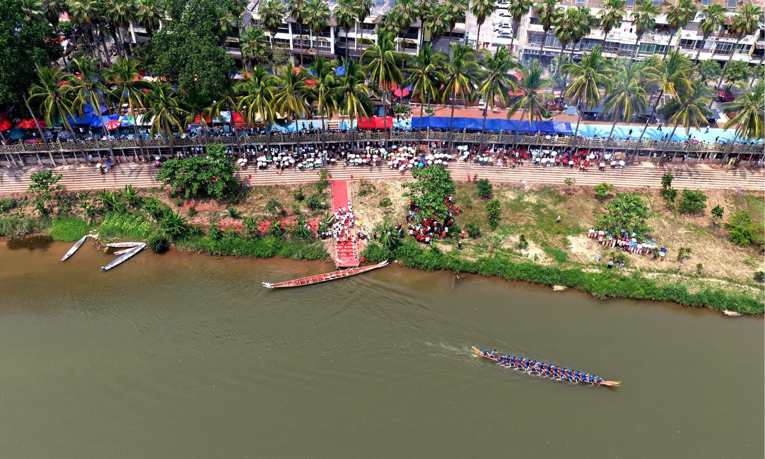 伴随着铓锣、象脚鼓的激昂节奏和阵阵爆竹声,比赛鸣枪开赛。赛事采用分组对决制,共设5个小组,每组两支队伍各进行两轮比拼,以最佳成绩计入总排名。参赛队员们喊着整齐的号子奋力挥桨,看台上身着节日盛装的群众与游客为选手们呐喊助威,现场气氛热烈。